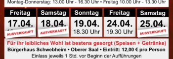 Liebe Theaterfreunde, es ist wieder soweit! Bereits seit Wochen sind wir fleißig am Proben für unsere diesjährige Aufführung. In diesem Jahr heißt es Jubiläum! 25 Jahre Theaterkracken: Die Schwebheimer Theaterkracken … Vorverkauf ab 16.03.2026 – „JUHUbiläum“ – 25 Jahre Theaterkracken weiterlesen